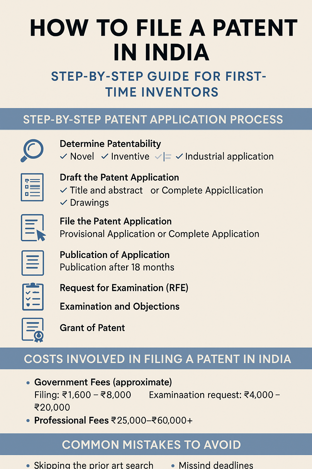 Professional Fees: Patent agents typically charge ₹25,000–₹60,000+ for drafting and filing, depending on complexity.