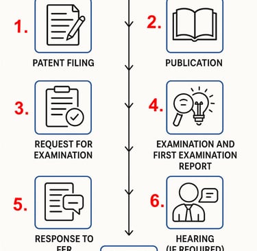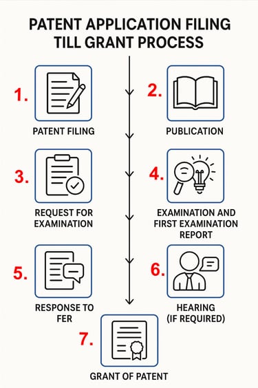 1. Patent Application Filing: Application is filed at the Indian Patent Office (IPO) with complete or provisional specification.
